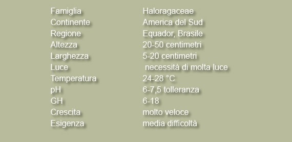 Myriophyllum matogrossense è una pianta proveniente dal Mato Grosso (Equadors, Brasile e Perù).