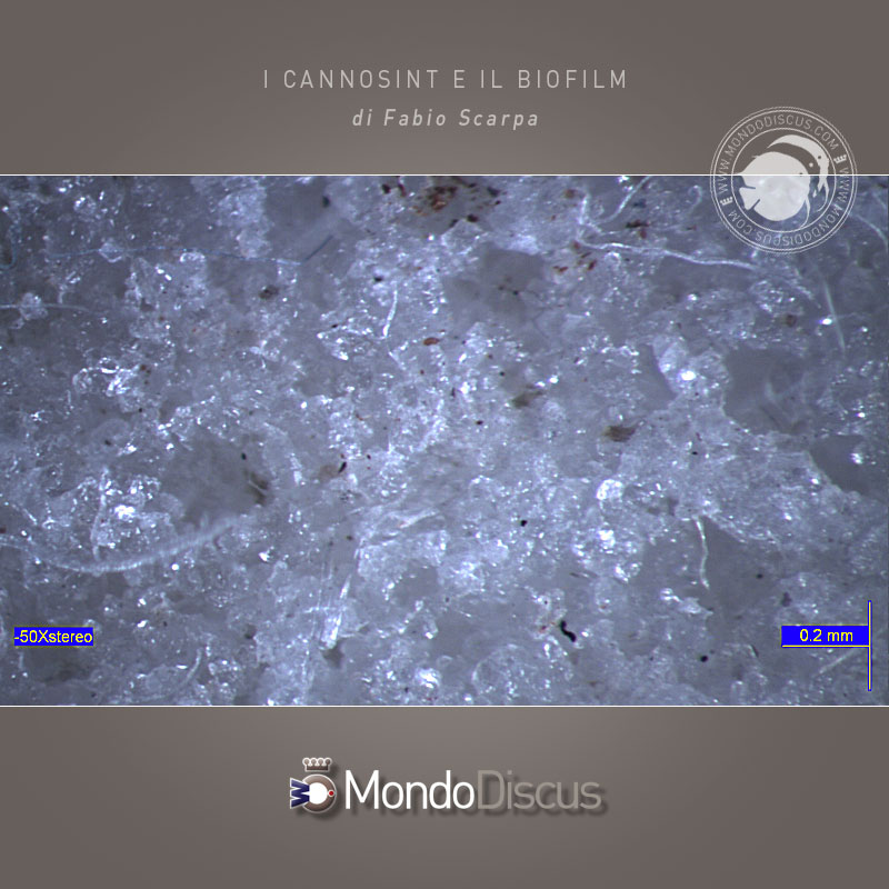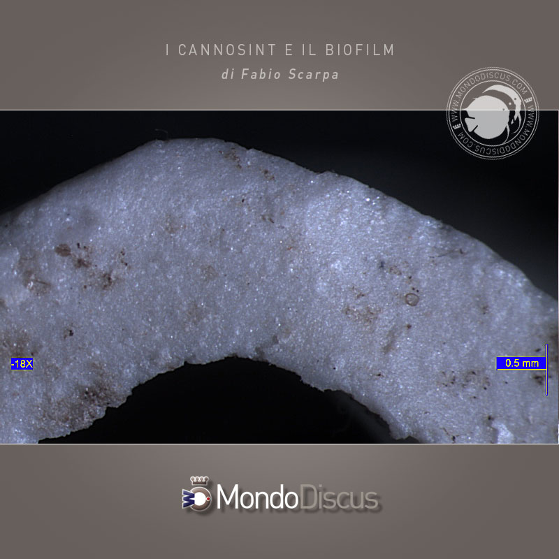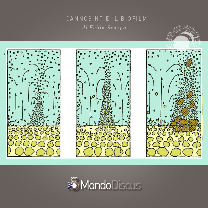 Bisogna ricordare che un elevato spessore del biofilm può letteralmente staccarsi in seguito a brusche variazioni di velocità di transito dell’acqua causate da fermate volontarie durante le pulizie del filtro, o involontarie durante interruzioni di corrente; il biofilm si stacca fisicamente dai supporti biologici finendo in vasca con formazione di torbidità e picchi di ammoniaca dato che il biofilm non è più investito dall’acqua ma ne viene trasportato con conseguente drastica riduzione del potere nitrificante. Come detto prima, se le cavità si tappano, il nostro sinterizzato diventa come un ceramico, anzi le colonie batteriche insediate all’interno sono in condizioni di anaerobiosi e possono causare fenomeni di parziale denitrificazione con la formazione di composti azotati parzialmente ridotti come nitriti e ammoniaca, o anche la proliferazione di ceppi batterici antagonisti a discapito dei nitrosomas e dei nitrospira, bisogna evitare quindi che particelle solide arrivino fino ai cannosint. Evitare che ciò accada al 100% è impossibile a causa dei fenomeni di flocculazione che portano le micro particelle ad unirsi ed ai batteri morti, ma con un buon flusso di acqua possiamo trascinare il più possibile tali macro particelle attraverso i cannosint, e con un ottimo prefiltro possiamo evitare che queste o altre macro particelle ci arrivino.