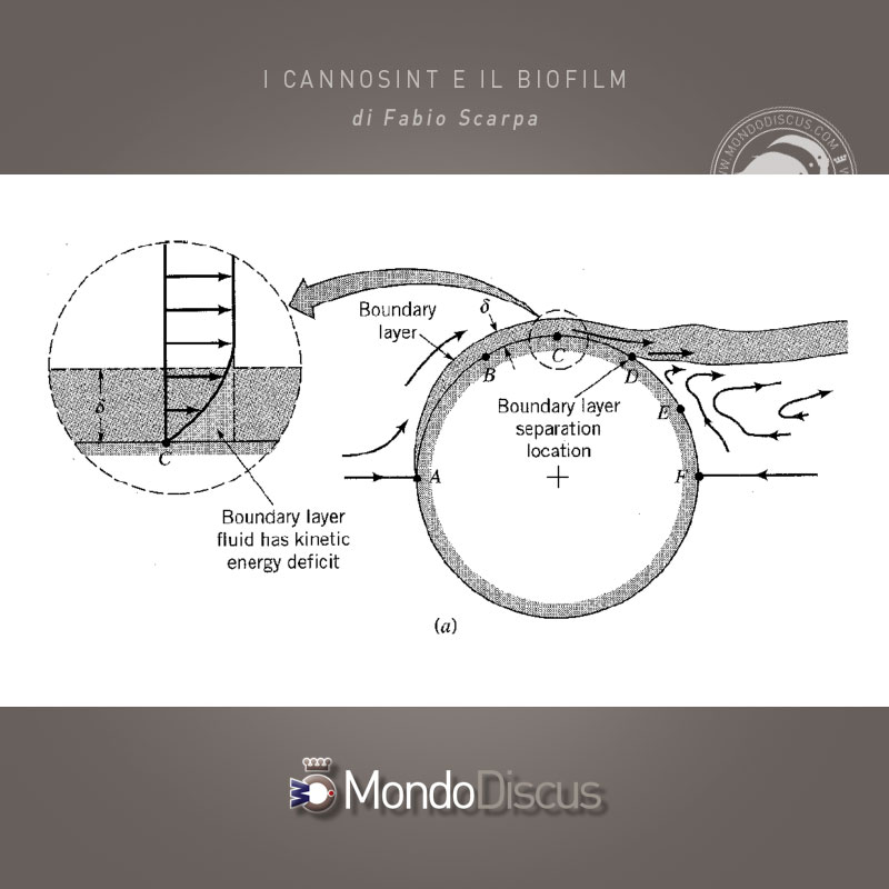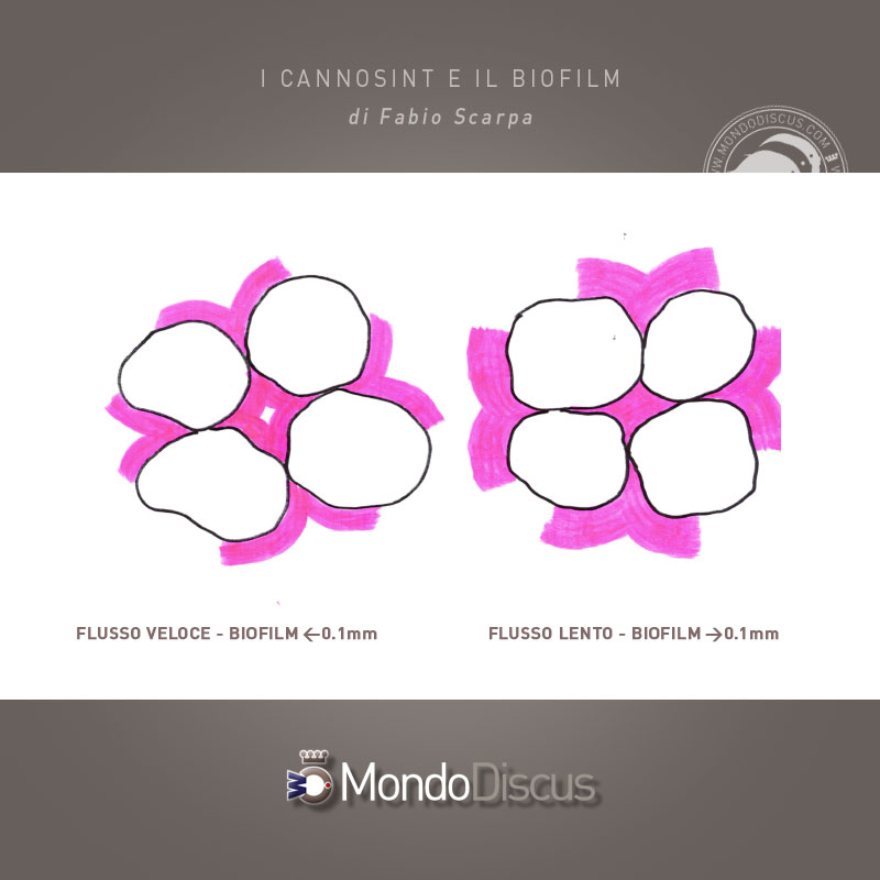 Un ridotto spessore di biofilm inoltre segue le cavità evitando che la superficie diventi piatta, ciò permette di mantenere elevato l’attrito superficiale dell’acqua instaurando un flusso turbolento e diminuendo l’effetto scia in maniera che l’acqua lambisce totalmente la superficie rugosa dei cannosint a tutto vantaggio della superficie filtrante che si riesce a sfruttare in quanto si eliminano le zone morte che a loro volta farebbero aumentare lo spessore del biofilm. E’ indispensabile quindi che l’acqua arrivi priva di sedimenti e che lo spessore del biofilm non sia elevato.